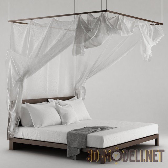 3d-модель современной кровати с балдахином. Кровать имеет очень лаконичный, простой дизайн, основу из темного дерева, и белоснежное белье. Все вместе лишь подчеркивает выразительность и легкость балдахина, который придает модели уют и романтичность.