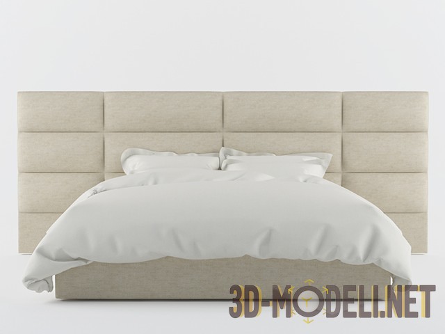 3D модель двуспальной кровати с широким изголовьем, «Frey», от производителя Marko Kraus. Современная кровать , огромное изголовье которой обтянуто бежевой тканью. Благодаря простежке имеет такой вид, будто оно состоит из шестнадцати прямоугольников. Основание кровати также мягкое, а на ней находится белый комплект белья с четырьмя подушками, что придает кровати ощутимую свежесть.