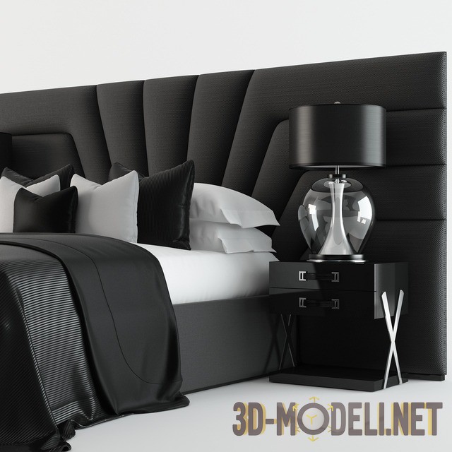 3D модель мебели для спальни: кушетка, прикроватные тумбы с настольными лампами, и кровать с изголовьем Meridian, производство The Sofa & Chair Company, Лондон. Гламурный стиль арт-деко, который предлагает изголовье, станет поразительно красивым дополнением к изысканному интерьеру спальни. Смелые геометрические линии задают своеобразную динамику, а роскошные слои прокладки обеспечивают комфорт. Этот универсальный предмет хорошо сидит на множестве кроватей, в том числе, и из ассортимента компании. Модель выполнена очень качественно, смотрится реалистично, все текстуры есть.