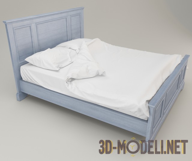 3D модель деревянной двуспальной кровати голубовато-серого цвета с ярко-выраженной структурой дерева (дуб). На кровати белоснежное постельное белье. Дизайн предполагает использовать ее в интерьере в стиле прованс.