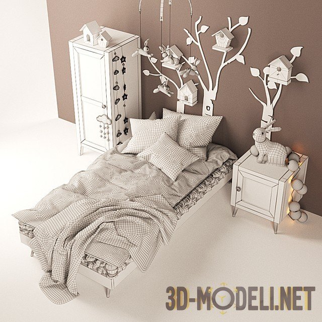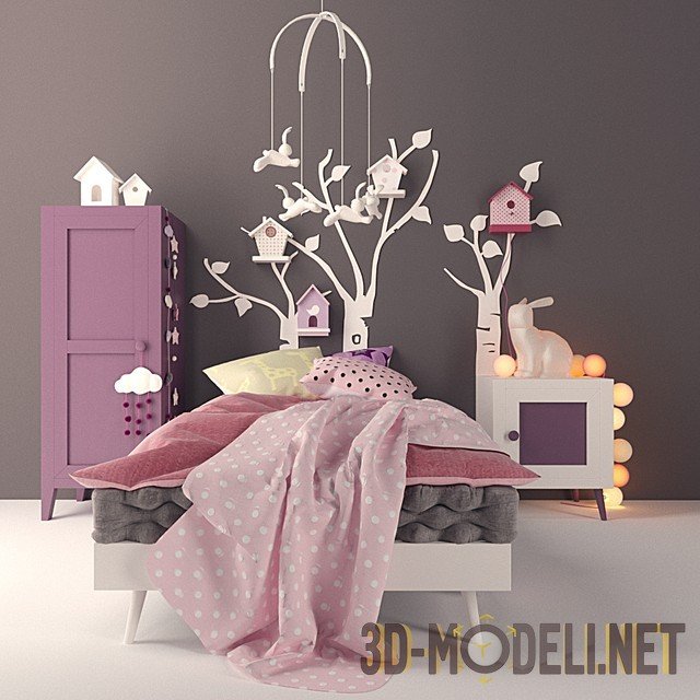 Набор мебели для детской комнаты, в комплекте с разнообразным декором. Кровать, небольшой шкафчик и тумбочка имеют спокойный и стильный дизайн, присутствует постельное белье, покрывало, подушки. Панно с деревом, милые кролики и симпатичные домики создают романтичную, уютную атмосферу.