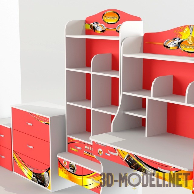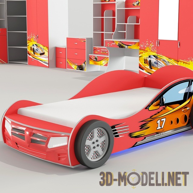 Еще один вариант набора мебели для детской комнаты Advesta Sport. Выполнена в тематике автомобильных гонок: кровать в форме машины, стильные наклейки на шкафах и столике. Кровать имеет светодиодную подсветку фар и днища. Поставляется с настроенными материалами и текстурами.