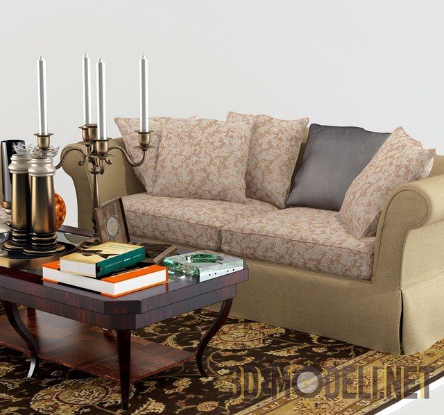 Мебельная группа с набором декоративных элементов. Красивый ковер с изысканным узором является прекрасным фоном для размещения мягкого дивана в тканой обивкой и кресла в той же стилистике. Комплект дополнен журнальным столиком из дерева, с изогнутыми ножками и полкой внизу. Столешница уставлена множеством аксессуаров, среди которых особенно выделяется латунный подсвечник. Готовая композиция для интерьера традиционной гостиной.