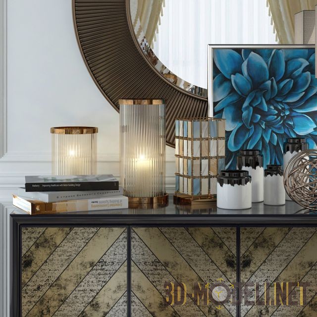 Набор нескольких интерьерных предметов, предназначенных для декорирования интерьера, Houzz, в комплекте с консольной тумбой и круглым зеркалом. Книги, свечи, картина и настольная лампа отлично сочетаются вместе, что поможет создать гармоничный акцент.
