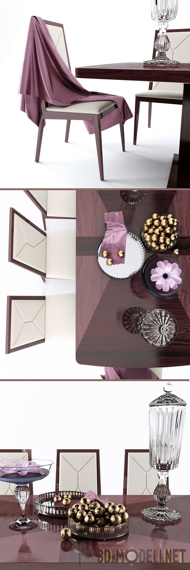Комплект мебели для столовой или гостиной, включает в себя стол и стулья из серии EVA collection от производителя ALF Italia. Артикул стола PJEV0615, размеры (с дополнительным модулем 50 см) 200/250 х 105 х 75,9 см. Артикул стула KJEV620BT, габаритные размеры: 51 х 59 х 110 см. Указанные на рендере декор: плед, вазы, салфетка, цветок, конфеты и пр. присутствует.