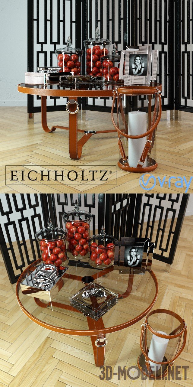 Аксессуары Eichholtz (Нидерланды) и набор декоративных предметов для наполнения интерьера в колониальном стиле. На круглом стеклянном столике с коричневой кожаной окантовкой столешницы и каркасом, обтянутым таким же материалом с белой прострочкой, стоят три стеклянных ёмкости с крышками. Ёмкости заполнены красными яблоками. Ещё на столешнице: квадратная пепельница из толстого стекла, шкатулка из хромированного металла и фоторамка из фацетированного зеркала. Рядом со столиком – выполненный в том же стиле, с рыжими кожаными ремнями с белой прострочкой и стеклом, большой подсвечник с толстой белой свечой. За столиком – расставлена четырёхплоскостная ширма в ориентальном стиле, из чёрных деревянных реек.