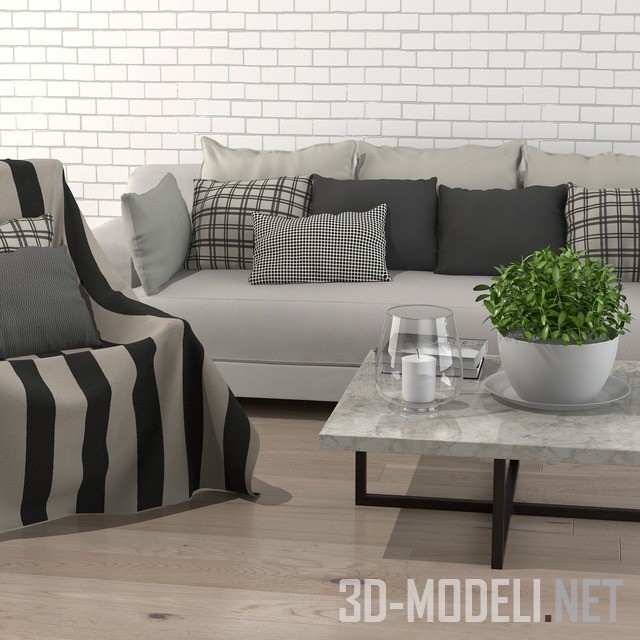 Современный диван с короткими черными ножками и широкими низкими подлокотниками, обтянут белой тканью. К спинке дивана прислонен ряд белых больших подушек, а перед ними еще ряд темно-серых, клетчатых, и серых однотонных. Перед диваном стоит журнальный столик на двух металлических рамках-ножках черного цвета. На прямоугольной мраморной столешнице с серо-белыми разводами стоит прозрачная ваза со свечой внутри и большой белый горшок с густой шапкой вьющихся мелких листочков. Рядом с диваном предусмотрено кресло, накрытое серым пледом в черную широкую полоску.