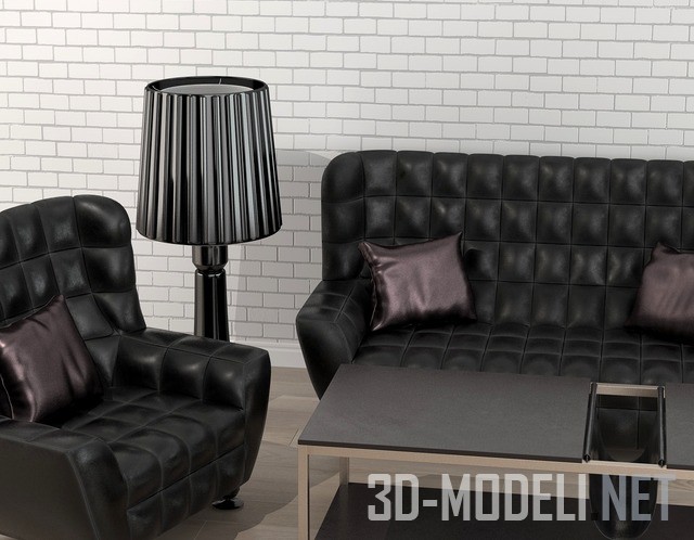 Возле стола стоит черный глянцевый торшер с большим полосатым абажуром в форме усеченного широкого конуса и диван с креслом. Диван и кресло обтянуты дорогой кожей цвета горького шоколада с металлизированным блеском, которая прострочена квадратиками.