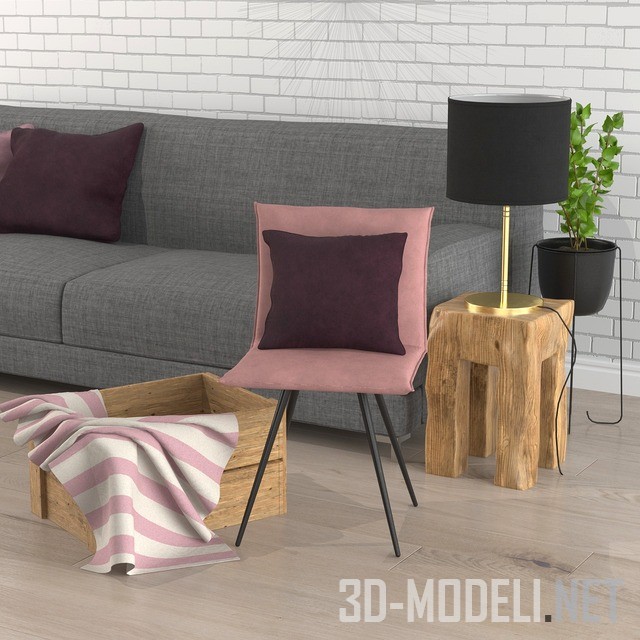 Очень приятная современная композиция для пространства гостиной, состоящая из дивана, обтянутого серой тканью с розовыми и фиолетовыми декоративными подушками, деревянной тумбочки-стола, на которой стоит настольная лампа с черным большим абажуром и стула с подушкой. Возле стула стоит небольшой деревянный ящик, на который небрежно брошено полотенце в белую и розовую полоску. Изюминкой инсталляции является сверкающая золотая бочкообразная подставка, на которой в черном горшке стоит ярко-красный цветок. Сверху свисает современный светильник в форме шара.