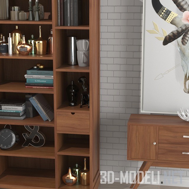 Большой деревянный шкаф с открытыми полками, на которых находится множество различных предметов: книги, часы, флаконы золотые и матовые и др. В наборе привлекает внимание большая картина в тонкой белой рамке. На картине изображен череп большого быка, пронзенный стрелами с оперением. На верху черепа между узорчатых быков расположена своеобразная композиция из трех нежно0розовых роз и серо-черных перьев крупных хищных птиц. Это напоминает символику североамериканских индейцев. Под картиной стоит небольшая прямоугольная тумба с вазой в виде коралла на столешнице.