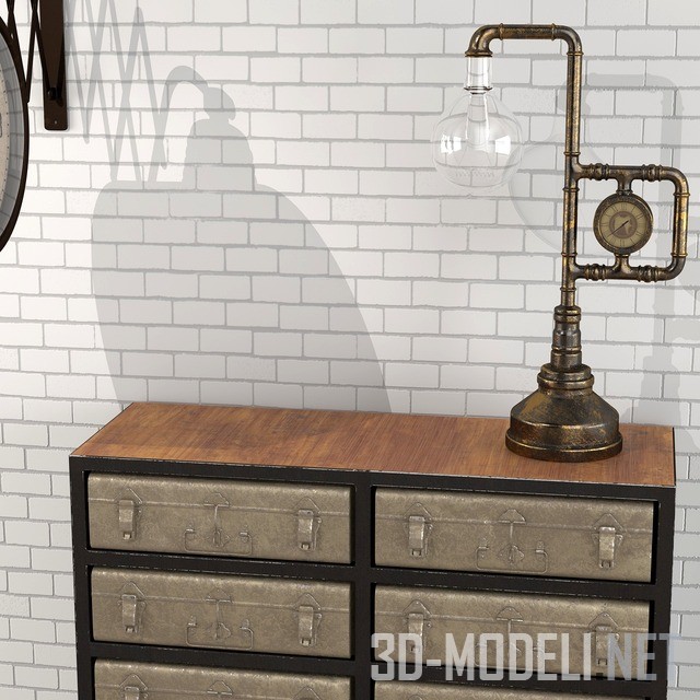 Интерьеру с ноткой стиля стим–панк придаст колорита несколько предметов из этого набора. Комод, сделанный в виде металлического стеллажа с выдвижными ящиками в виде винтажных чемоданов, настенные часы и светильник. Настольный светильник с лампой в большой прозрачной колбе изготовлен из обрезков латунных труб, фитингов, муфт и уголков. Небольшие часы, стилизованные под манометр, смонтированы сбоку. Большие, с перпендикулярным стене выдвижным кронштейном, двухсторонним циферблатом и настенным крепежом часы, сделаны по типу старинных вокзальных.