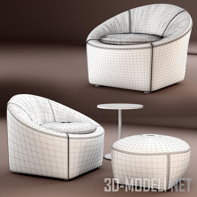 Capri представляет собой небольшое кресло с современной концепцией дизайна и извилистыми линиями. Рама изготовлена из металла, Подушка для сидения заполнена секционированным гусиным пухом и дополнена высокопрочной полиуретановой вставкой. Ткань и кожа в качестве обивки полностью съемные, удаляются с помощью молнии. В наборе мебели также присутствует небольшой круглый столик и удобный пуф. Производитель мебели: бренд Minotti. Модель высокого качества, с настроенными материалами и текстурами в архиве.