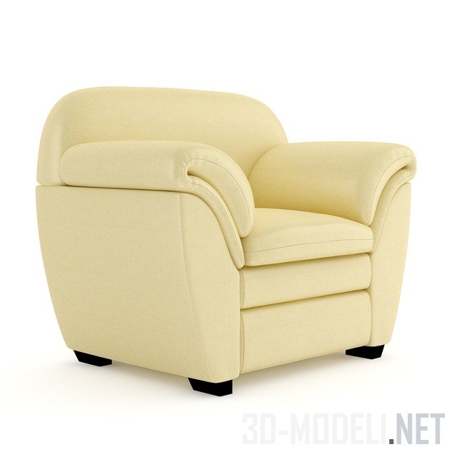 Красивый комплект мягкой мебели, состоящий из большого комфортного дивана и такого же кресла, обтянутых светло-бежевой кожей. Такой комплект будет хорошо смотреться в интерьере современной гостиной, придавая ему дополнительный уютный штрих, или в более традиционно оформленном пространстве.