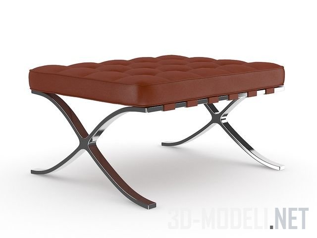 Набор современной мягкой мебели с коричневой кожаной обивкой мягких подушек и хромированными металлическими элементами. Пуф, кресло, и диван. Нижние рамы изготовлены из плавноизогнутых «Х»–образных элементов. Наружные плоскости мягких подушек декорированы прострочкой капитоне.