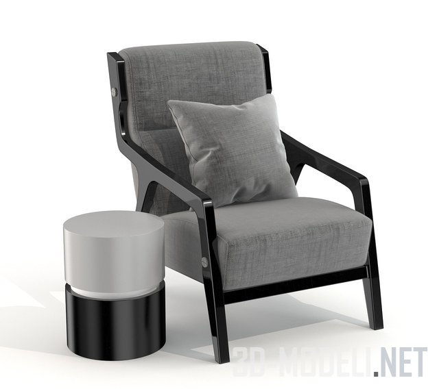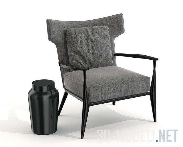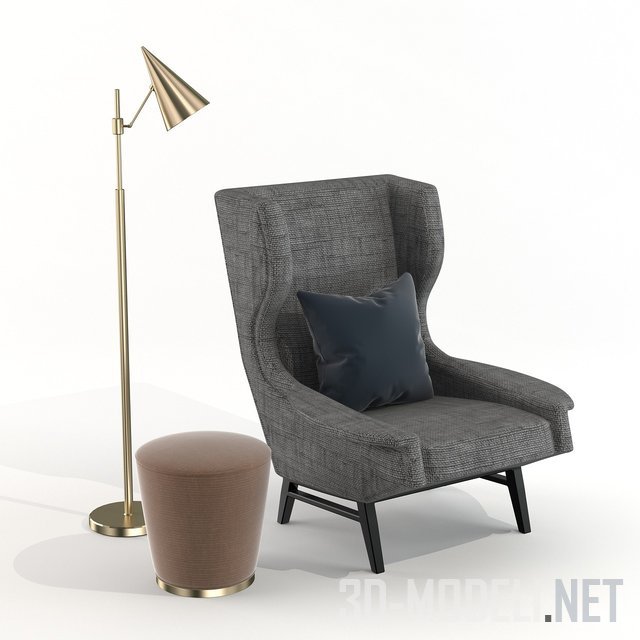 Четыре разных мебельных наборов, в составе которых есть кресло, как центральный предмет, тумбочки, вазы, светильник. Все 3д-модели помещены в одну сцену, материалы и текстуры имеются.