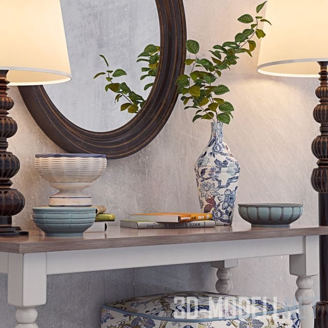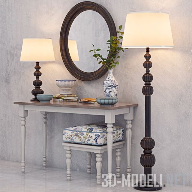 Декоративный набор предметов мебели и декора для наполнения интерьера спальни в классическом стиле. В комплект входит туалетный столик с пуфом, настольная лампа и торшер из одной коллекции, зеркало и аксессуары (цветы, ваза, книги).