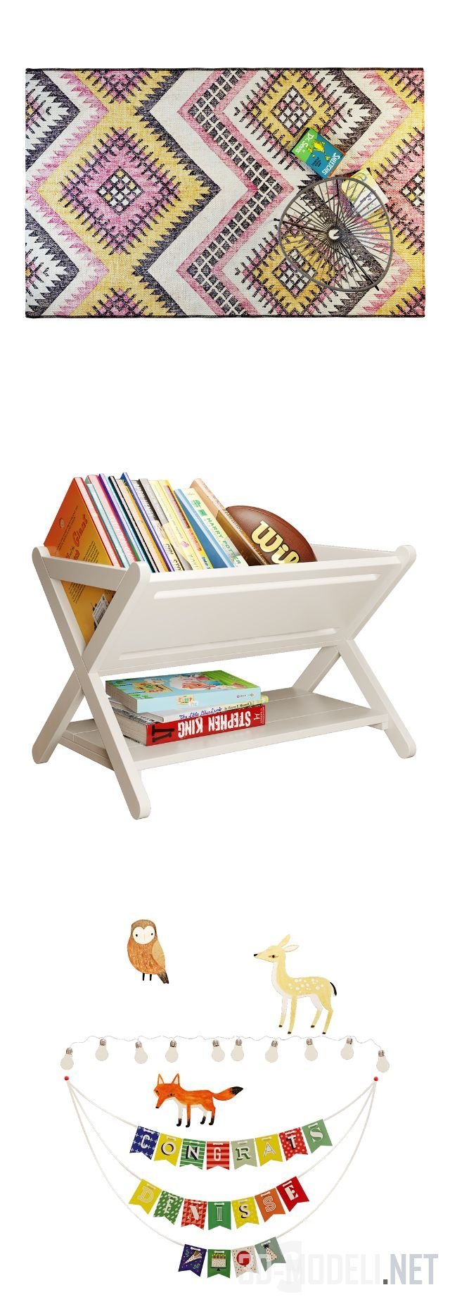 Набор мебели и аксессуаров от бренда Crate & Barrel для детской комнаты в этно-стиле. Кроватка выполнена в виде хижины с высокой двухскатной крышей из белых досок и реек, вскрытых прозрачным лаком. По фронтонам вырезаны крупные круглые «окошки». Под кровлей развешены гирлянды с лампочками и новогодними флажками. Стена над кроваткой декорирована фигурками животных и птиц, стилизованных под детские рисунки. Торшер с точеной высокой ножкой синего цвета увенчан расписанным абажуром, с изображением ночного пейзажа в сине-зеленых тонах. На коврике в этно-стиле расположилось ажурное кресло и деревянная белая газетница с журналами, книжками и мячом для регби.