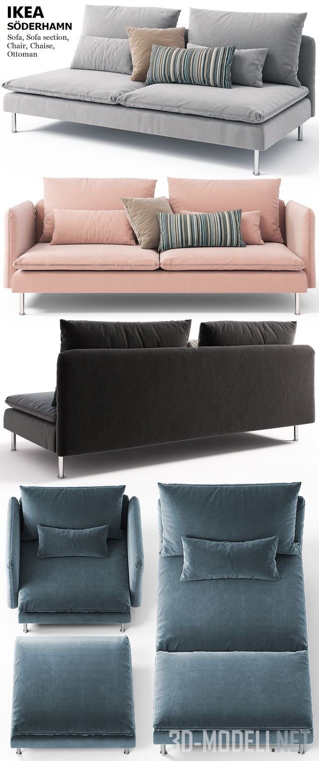 Серия комфортной м красивой мягкой мебели для современного пространства, SODERHAMN от IKEA. В наборе кресло, кушетка, пуфик. Предлагается четыре варианта расцветки: белый, розовый, черный и бирюзовый. Качественно выполненная трехмерная модель, с текстурами.