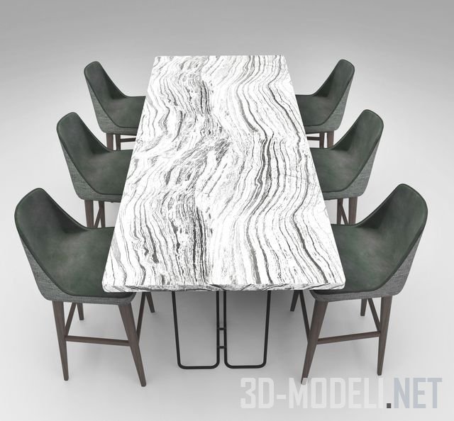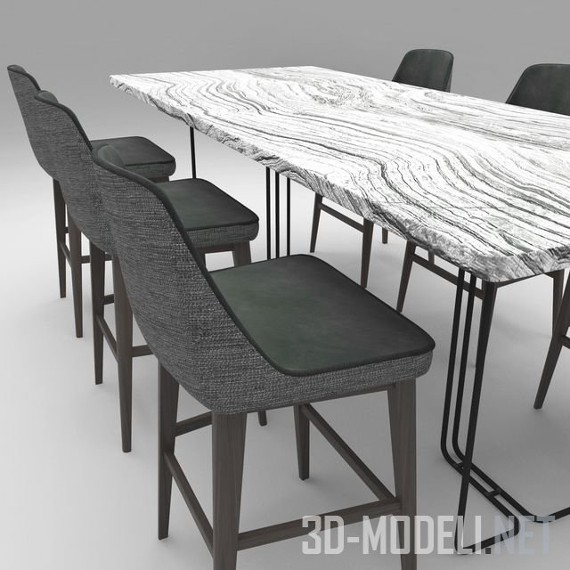 Набор современной мебели, в который входит кухонный обеденный стол с барными стульями. Комплект хорошо подходит для офисной кухни или гостиной. Ножки стола сделаны из матового металла, а столешница из черно-белого мрамора. В сочетании с тканью и деревом набор выглядит очень стильно.