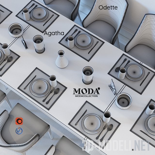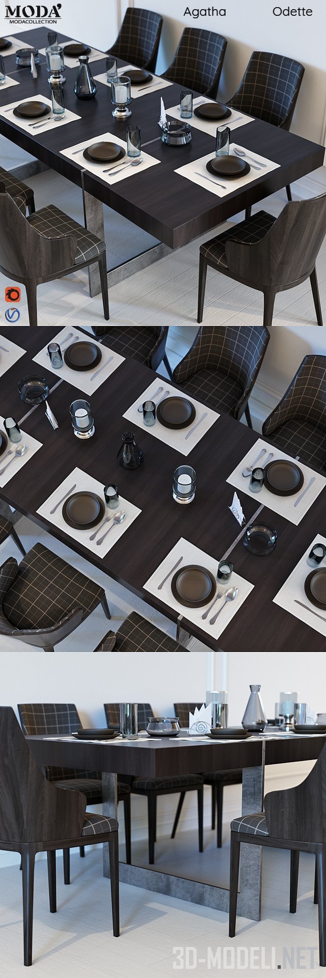 Набор мебели от Moda. В комплекте обеденный стол Agatha красивого шоколадного цвета. Столешница сделана из дерева, основа из металла. Размеры стола: 75 см х 244 см х 100 см. Стул Odette из ясеня, сиденье и спинка обиты клетчатой тканью в тон. Размер: 90 см x 60 см x 60 см.