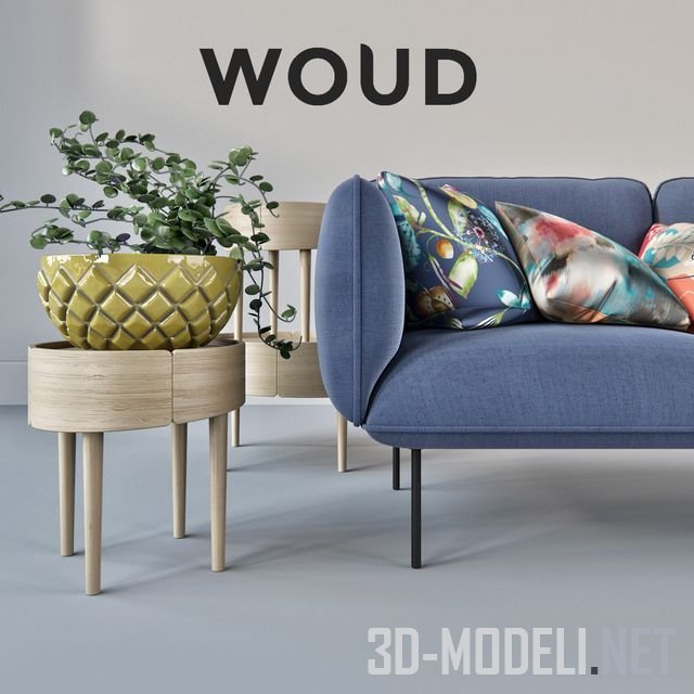 Высококачественный набор мебели, реалистичная 3d модель. В комплект входит мягкая мебель производства датской компании Woud. Это диван, кресло и оттоманка из коллекции Nakki и два кофейных столика из коллекции Skirt. Мебель дополнена декоративными элементами (вазон, подушки, шелковая ткань), который придают модели еще большую достоверность.