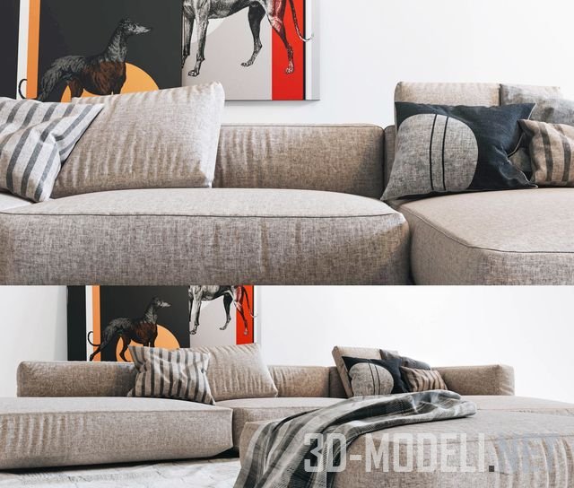 Высококачественный набор мебели для современной гостиной, диван и пуф Pianalto (размер дивана 432 x 186 x 96), производства Zanotta, кресло Moroso Novocento (67 x 67 x 71 см), а также ковер и подходящие по стилистике картины.