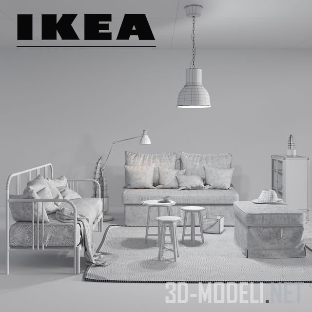 Набор современной мебели из каталога 2017-2018 года бренда IKEA. В комплект входит диван Himmene, кровать Firesdal, напольный светильник Ared, лампа Hektar, табурет для ног Ektorp, столики Kragsta, полка с книгами Fabrikor, коробки Kvarnik и Pudda.