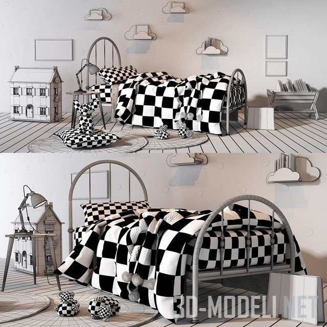 Чудесный набор мебели и аксессуаров для комнаты девочки: легкая кровать с постельным бельем и подушками, игрушки, кукольный домик, полки-облака с книгами, картины, ковер, столик с лампой и пр.