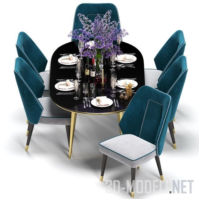 Набор мебели для элегантного пространства, в который входит обеденный стол с сервировкой и аксессуарами, а также стул Deux lounge, производства Inside Out.