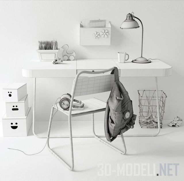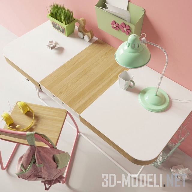 Набор мебели и предметов для детской комнаты. Комплект выполнен в белых, розовых и зеленых тонах. В основе набора стол и стул. На столе зеленое растение, часы, чашка, зеленая настольная лампа. На спинке стула висит рюкзак, слева от стола стоят друг на друге три коробки. Справа - корзина для бумаг. Веселой достоверности сету прибавляет скомканная бумажка, валяющаяся рядом с корзиной.