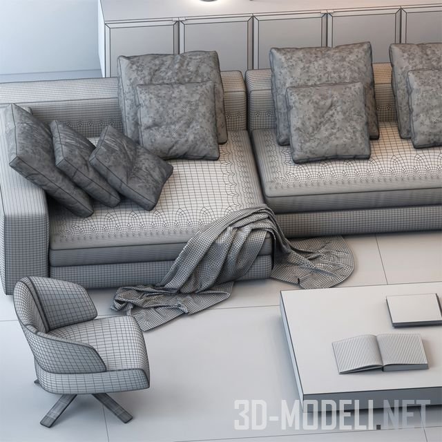 Современный мебельный сет от Minotti, с модульным диваном YANG серого цвета с декоративными подушками, низеньким креслом CREED и журнальными столиками RITTER и CLOSE. Набор дополняет тумба MORRISON и настольная лампа.