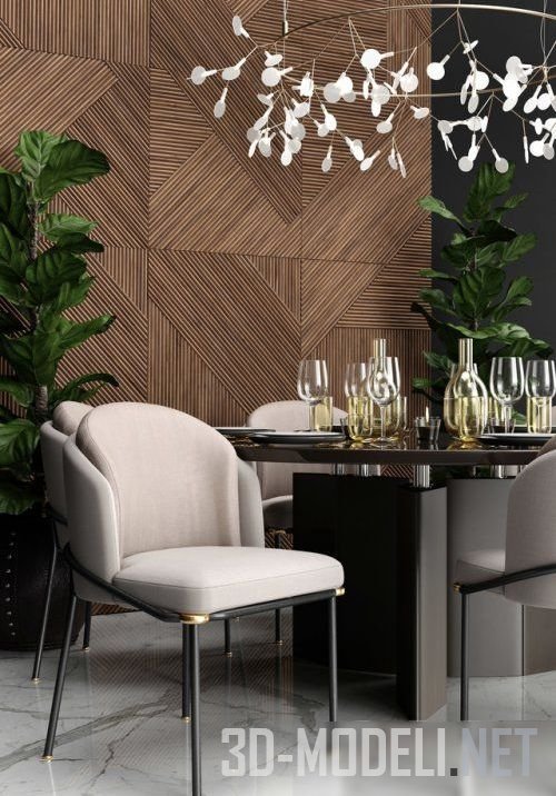 Мебельный сет от бренда Minotti. В комплекте с элегантной сервировкой на круглом обеденном столе и мягкими глубокими стульями бежевого цвета, набор станет украшением любого пространства. Декор из дерева, красивая люстра и зеленые растения идеально вписываются в композицию.