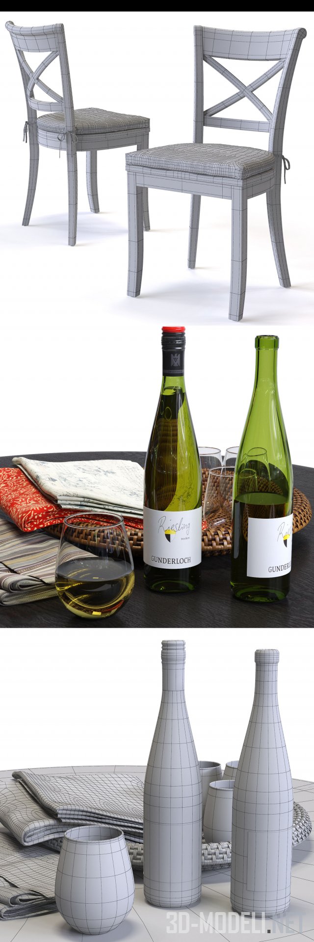 Набор мебели для столовой, гостиной или кухни, от бренда Сrate&Barrel. В комплекте круглый деревянный стол Avalon и стулья C&B Vintner, дополненные мягкими сиденьями. На столе присутствуют элементы сервировки (плетеная тарелка-поднос, стаканы, бутылки и салфетки). Реалистичная и качественная трехмерная модель.
