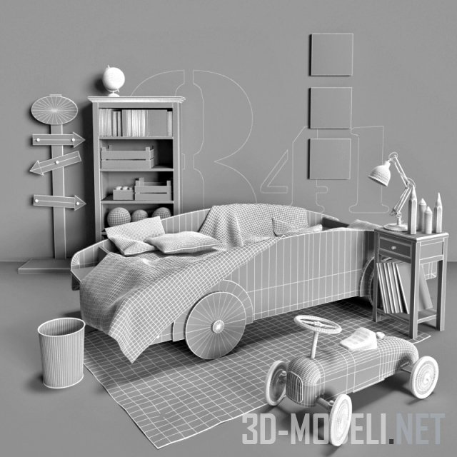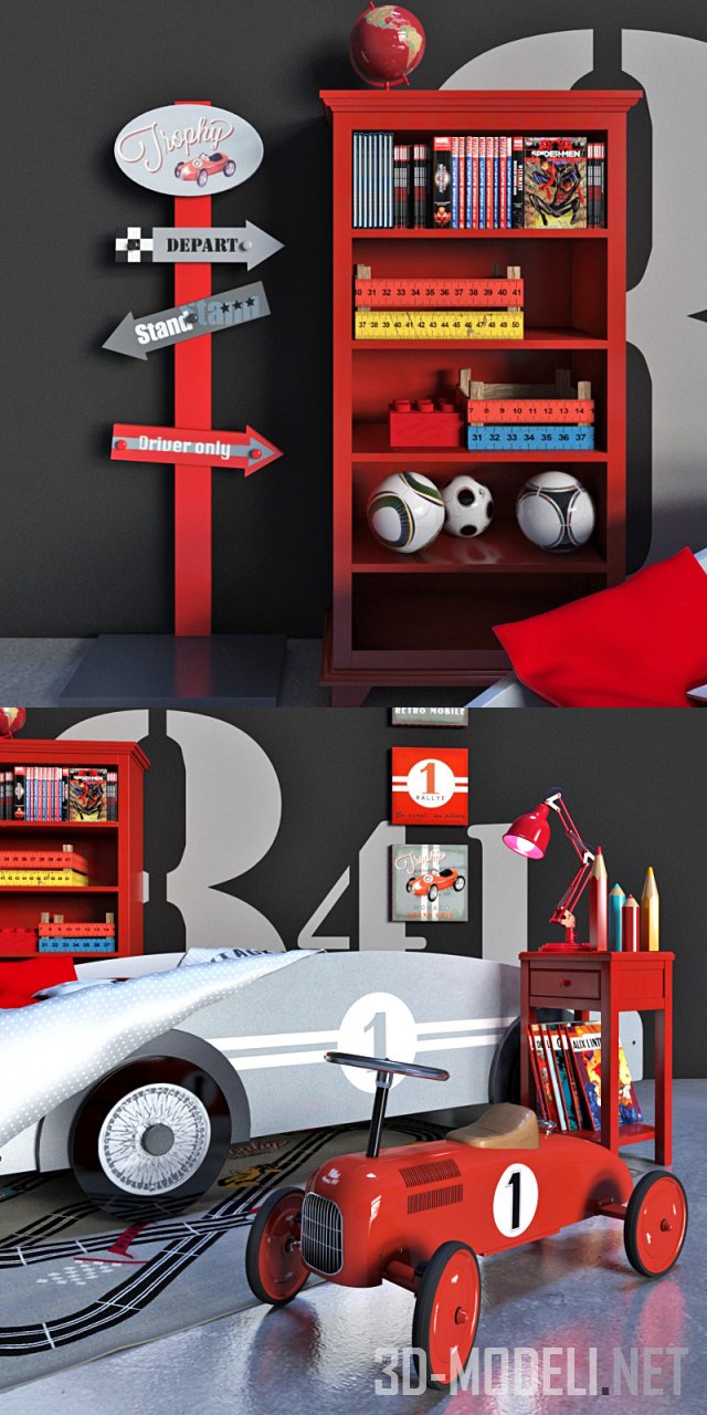Мебель и аксессуары в детскую комнату, стилистически посвященные истории автогонок. В наборе: детская кровать в виде серой гоночной машины с номером «1» на боку, стеллаж и тумба красного цвета и коврик со стилизованным изображением гоночной трассы. Винтажные постеры на данную тематику, красная игрушечная машина, декоративная стойка с указателями, настольная лампа, корзина для бумаг, глобус, комиксы, книжки и мячи на полке - аксессуары подобраны в едином цветовом и стилистическом решении.