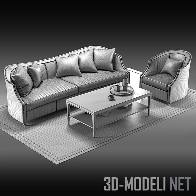 Комплект элегантной мягкой мебели для гостиной от фабрики CARACOLE. В наборе диван UPH SOFFUL 49A (его размеры 258 x 109 x 83H см), из той же серии кресло UPH CHALOU 80A (размеры кресла 81 x 91 x 84H см), журнальный стол TRA COCTAB 014 (137 x 76 x 46H см) и неброский ковер.