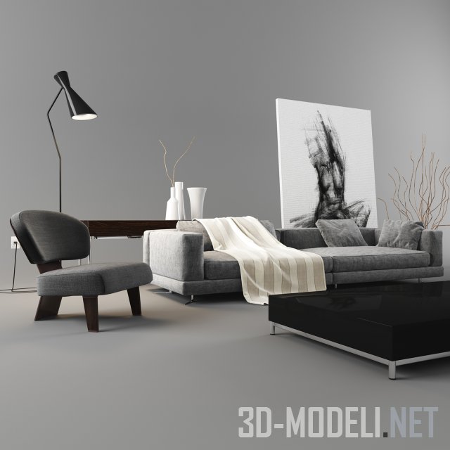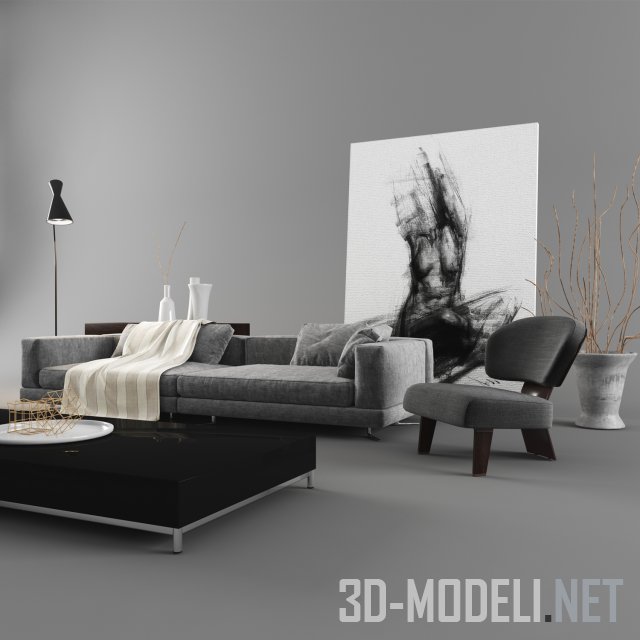 Стильный элегантный мебельный сет от Minotti. Содержит светло-серый диван с бежевым полосатым пледом, мягкий пуф, большой серой таблеткой лежащий возле длинного низкого стола с черной лакированной столешницей на маленьких металлических ножках. В комплекте также два черных кресла, современный высокий светильник на тонкой ножке с черным лаконичным абажуром и большая черно-белая абстрактная картина.