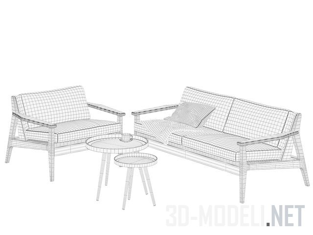 Лаконичный небольшой диван с деревянными подлокотниками и ножками светло-коричневого цвета и темной текстильной обивкой и точно такое же по дизайну кресло. Возле дивана стоят два небольших деревянных столика с круглыми столешницами с невысокими бортами.