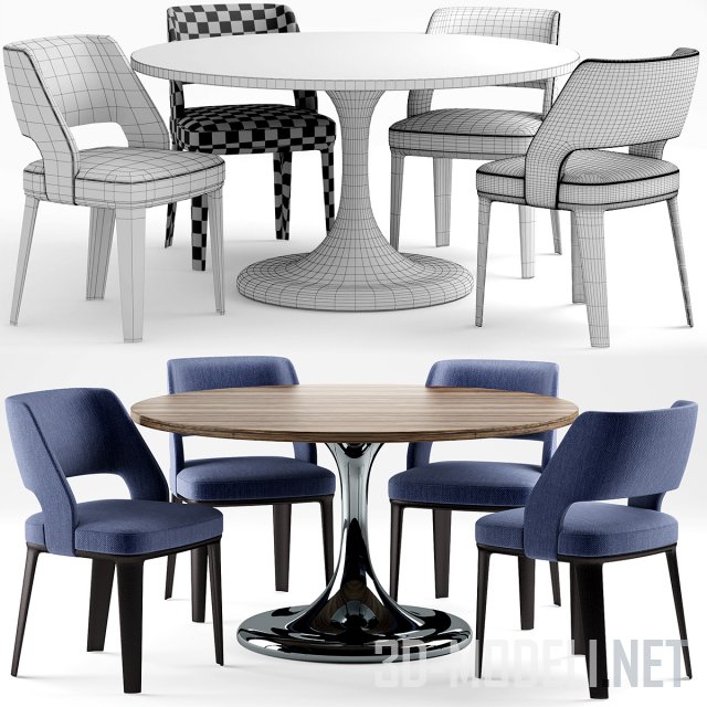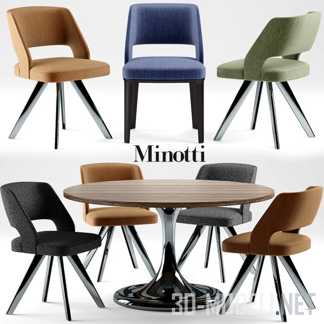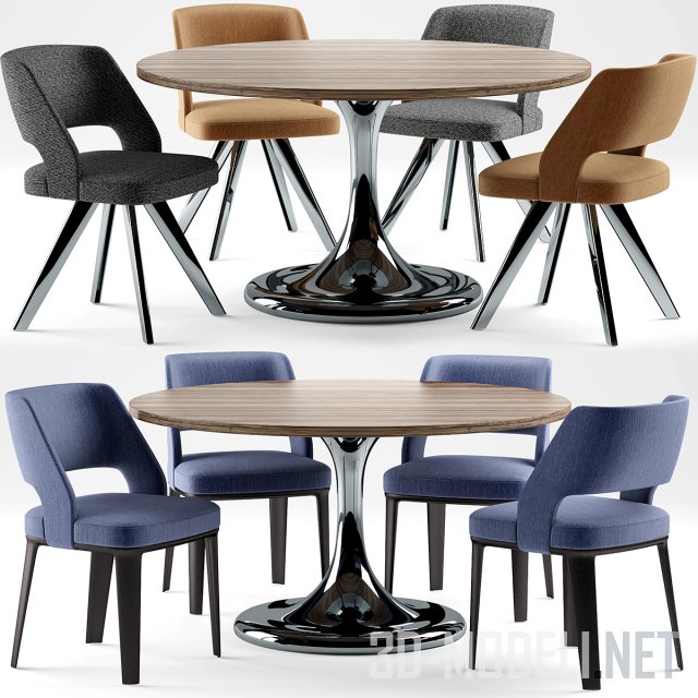 Мебельный сет от итальянского бренда Minotti, в которых входит обеденный стол NETO с овальной деревянной столешницей и оригинальной ножкой, словно стекающей лужицей под столешницу, и стулья OWENS с мягкой обивкой и прямыми черными ножками.