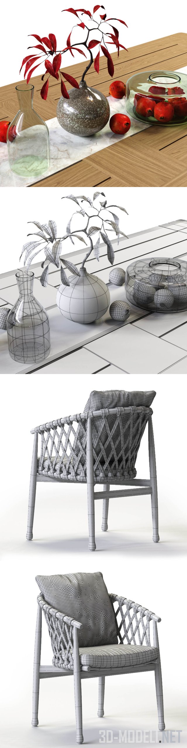 В той же коллекции представлены стулья из натурального тикового дерева, с извилистыми гармоничными линиями и переплетением из полипропиленового волокна, которое идеально подходит для наружного использования. Цвет подобран так, чтобы сочетать натуральное тиковое дерево с переплетением. Комфорт гарантируется подушками сидений и спинки.