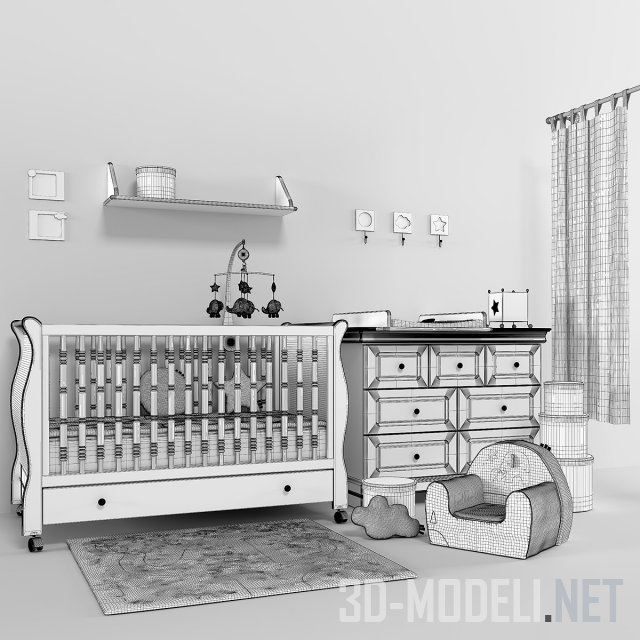 Элементы коллекции детской мебели Sauthon Elodie Blanc (детская кроватка, комод, пеленальный столик) и предметы коллекции baby deco Sauthon Babyfan: сиденье, ковер, занавеска, матрацы для пеленального столика. (68 х 52 см), одеяло (140 х 70 см), подушки (солнышко, облако, звезда), карусель (передвижная), детский светильник, фоторамка (комплект из 2 шт.), Вешалка-фоторамка (комплект из 3 шт.)