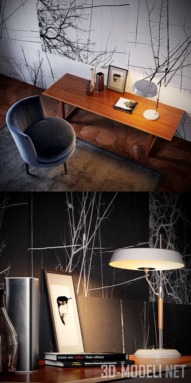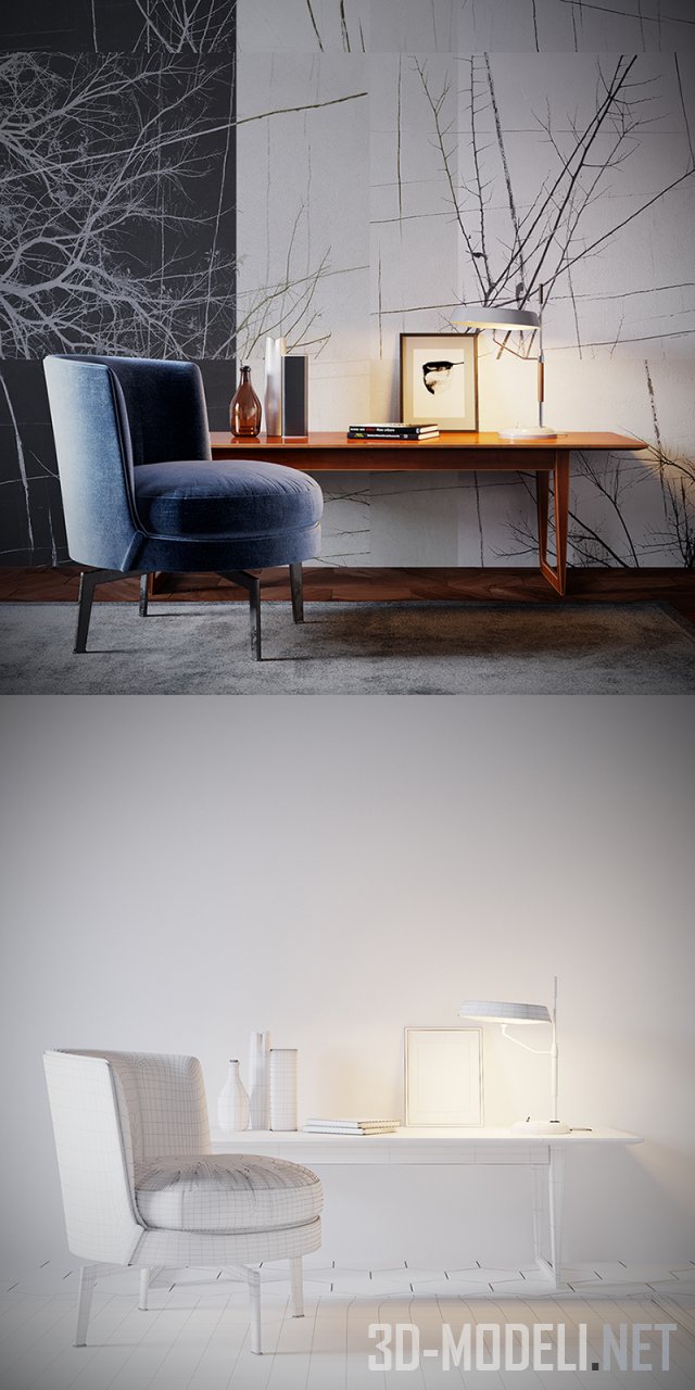 Набор мебели и аксессуаров, подойдет для домашнего кабинета, рабочего уголка в гостиной и пр. Мягкое красивое кресло, стол с настольной лампой, ковер и несколько ваз формируют законченную, реалистичную композицию.
