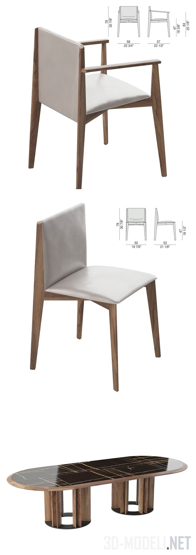 Мебельный сет Thayl&Ionis Porada, в который входит большой длинный стол овальной формы с двумя сложными деревянными ножками и глянцевой темно-коричневой столешницей с тонкими белыми линиями, а также два варианта светлых деревянных стула, обтянутых белым материалом.