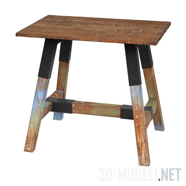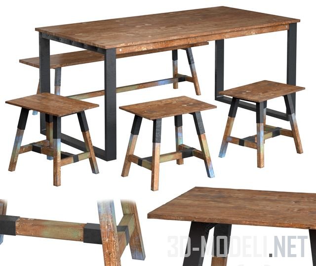 Набор мебели в рустикальном стиле для обеда на свежем воздухе, коллекция «Look» от производителя D-Bodhi. Стол на металлических ножках из профильной трубы, сваренной в две рамы, имеет габариты 180 х 90 х 78 см. В комплект столу предложены три табурета и длинная скамья без спинки из тех же материалов, что и стол.