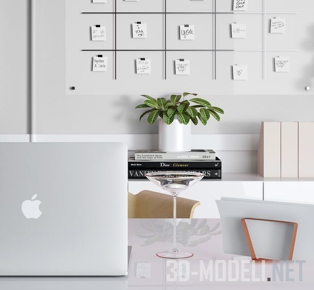 Современное рабочее место от IKEA: письменный стол на черных ножках из узкого прутка с глянцевой белой прямоугольной столешницей. На столешнице стоит стакан с ножницами и линейкой, открытый ноутбук и прозрачный органайзер. На стене за столом: часы, картина, зелый цветок и веселая гирлянда маленьких разноцветных шариков.