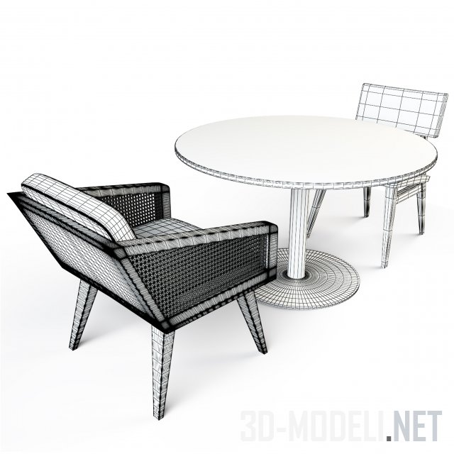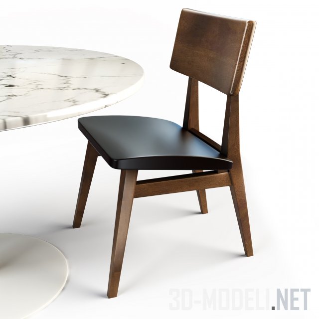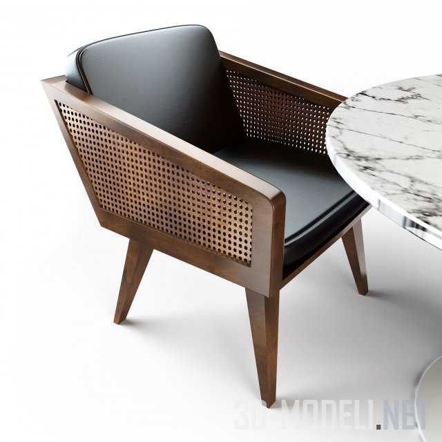 Мебельный сет МК, состоящий из стола с круглой мраморной столешницей и двух разных деревянных стульев коричневого цвета с черными кожаными сиденьями. Один из стульев имеет перфорированные боковины.
