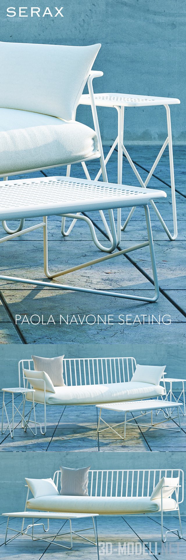 Мебельный сет PAOLA от бренда Serax (дизайн Paola Navone). Состоит из дивана белого цвета с мягким сиденьем и жесткой спинкой из тонких прутьев, легких кресел такой же конструкции, кофейного столика и приставного столика (отлично смотрится по двум сторонам дивана). Вся мебель дышит легкостью и изяществом.