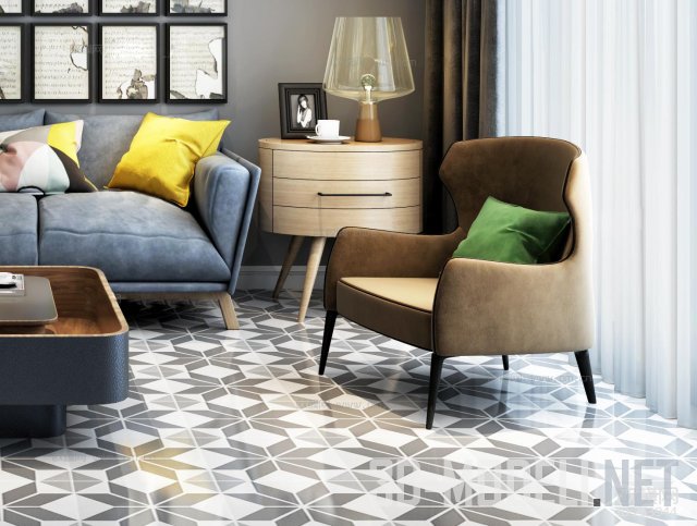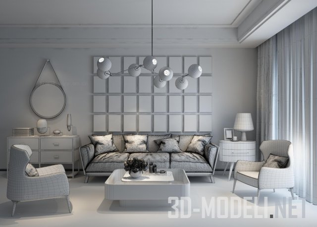 Комплект мягкой мебели и декоративных элементов для создания интерьера гостиной, кабинета и пр. Оригинальное настенное панно, состоящее из 4х8 элементов, создает хороший фон для демонстрации мягкой мебели и других деталей интерьера. Тумбочки представлены в отделке белый и дерево, двойной журнальный стол имеет необычную конструкцию. Светильники подобраны в стилистике пространства, ковер, яркие диванные подушки и сочная обивка одного из кресел органично сочетаются с остальными предметами обстановки.