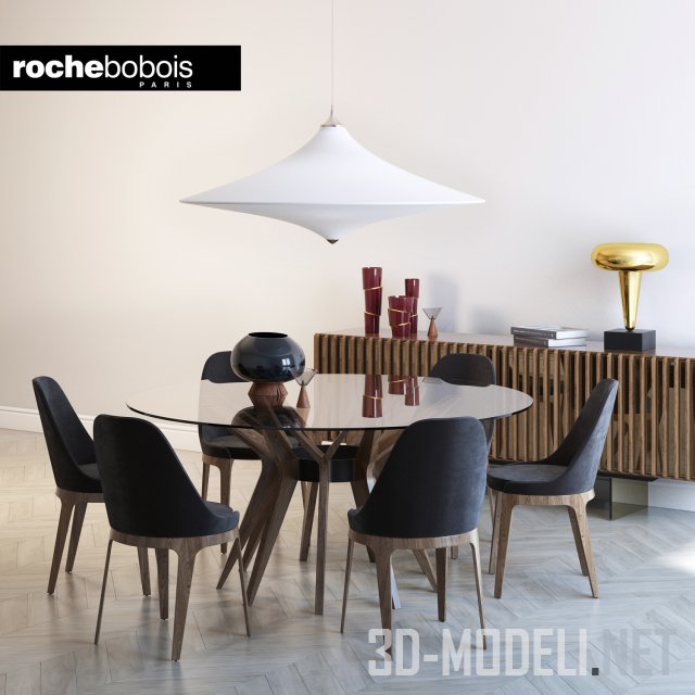 Набор мебели и декора от производителя Roche Bobois. Сцена содержит обеденный стол ASTER Roche bobois (H. 74 D. 160), стул TOURNICOTI Roche bobois (W. 53 x H. 81 x D. 57), комод PALIS SIDEBOARD Roche bobois (W. 215.9 x H. 79 x D. 47,6), люстру Luminaire AIRE SUSPENSION Roche Bobois (D. 120), а также вазы: GRAVITY COCKTAIL GLASSES (W. 11 x H. 14), GRAVITY VASE (W. 30 x H. 28), DECALAGE VASE (W. 13 x H. 20 W. 8 x H. 28 W. 11 x H. 34).