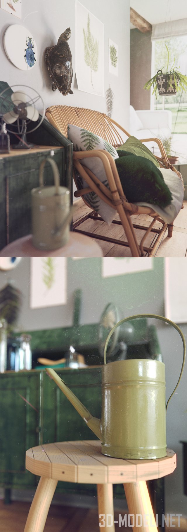 Декоративный интерьерный набор мебели и аксессуаров «Маленький парк» в зеленых тонах, от L'atelier. В комплекте следующие предметы: небольшой ротанговый диванчик с тремя диванными подушками в оттенках зеленого, винтажное бюро зеленого цвета с аксессуарами и старинным вентилятором, табурет, жестяная садовая лейка, коллекция панно с природной тематикой на стене (гербарий, акварели, чучело черепахи, кашпо с цветком), прогулочная трость, цветок в горшке, пластиковые холдеры с книгами.
