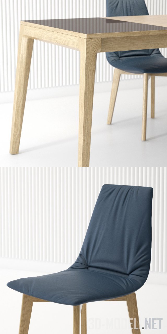Группа мебели Mylon Lui от TEAM 7 для обеденной зоны в современном стиле. Ножки стульев и стол изготовлены из массива дерева, под прозрачным лаком. Текстура дерева и его цвет отлично гармонируют с сине-серо-зелеными чехлами на мягких частях стульев со сплошной спинкой. Габарит стола: 200 х 90 х 75 см. Имеется конструктивная возможность удлинить столешницу вставкой 100 см.